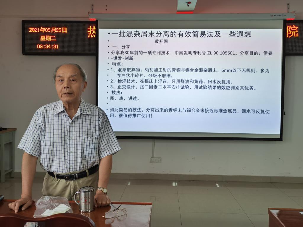 黄开国从自身工作经历出发,以一项简易有效分离混杂屑末专利技术来引出报告主题。通过这个示例,黄开国将复杂混合多金属粉末分离的过程简单明了地解释出来。随后,他又从分离粉末纯度、回水回收利用、操作难易程度等进行了专业的讨论。经过对专利方法的分析,黄开国引申出磨矿分级先部分选,浮选过程中关于分散剂、调整剂等对无捕收剂浮选的影响等相关技术问题。