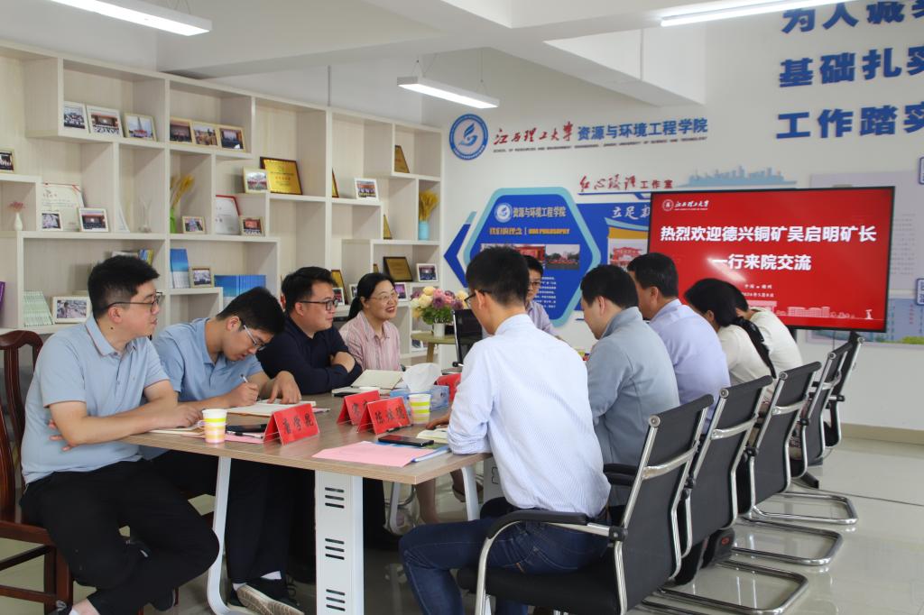 本网讯 5月8日,江铜集团德兴铜矿矿长吴启明、副矿长耿志强一行来院交流。我院院长何桂春和相关专业负责人会见来宾并在黄金校区逸夫实验楼工作室召开座谈会。