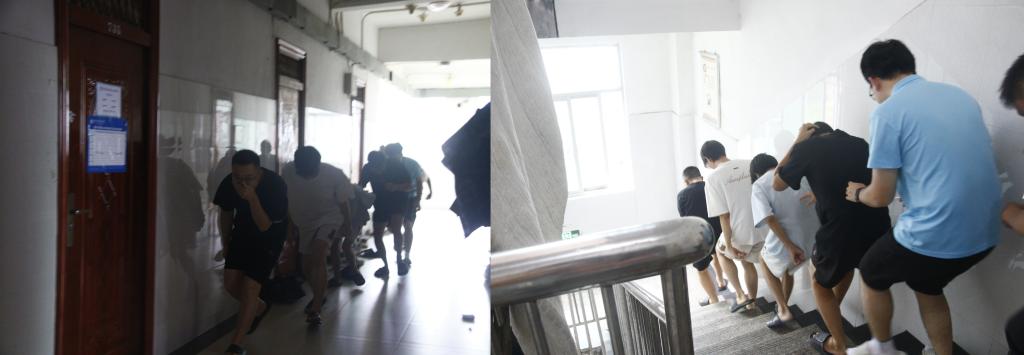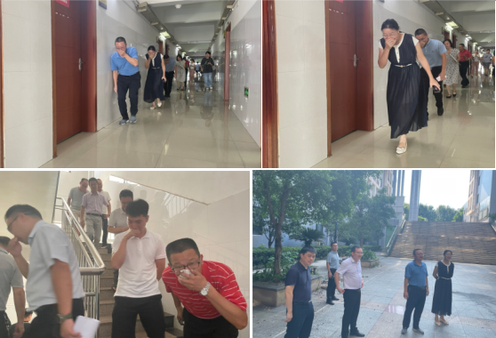 下午四点,在火灾预警信号发出后(假设大楼和宿舍西面起火报警),黄金校区两地各楼层安全指挥员积极引导师生,师生们迅速从东面楼梯下撤,途中各位师生用手(模拟湿毛巾)捂住口鼻,猫腰由楼梯靠右有序下楼到一层安全出口外集合地。随后,各楼层安全指挥员清点人数,确保全部人员疏散到安全地带。