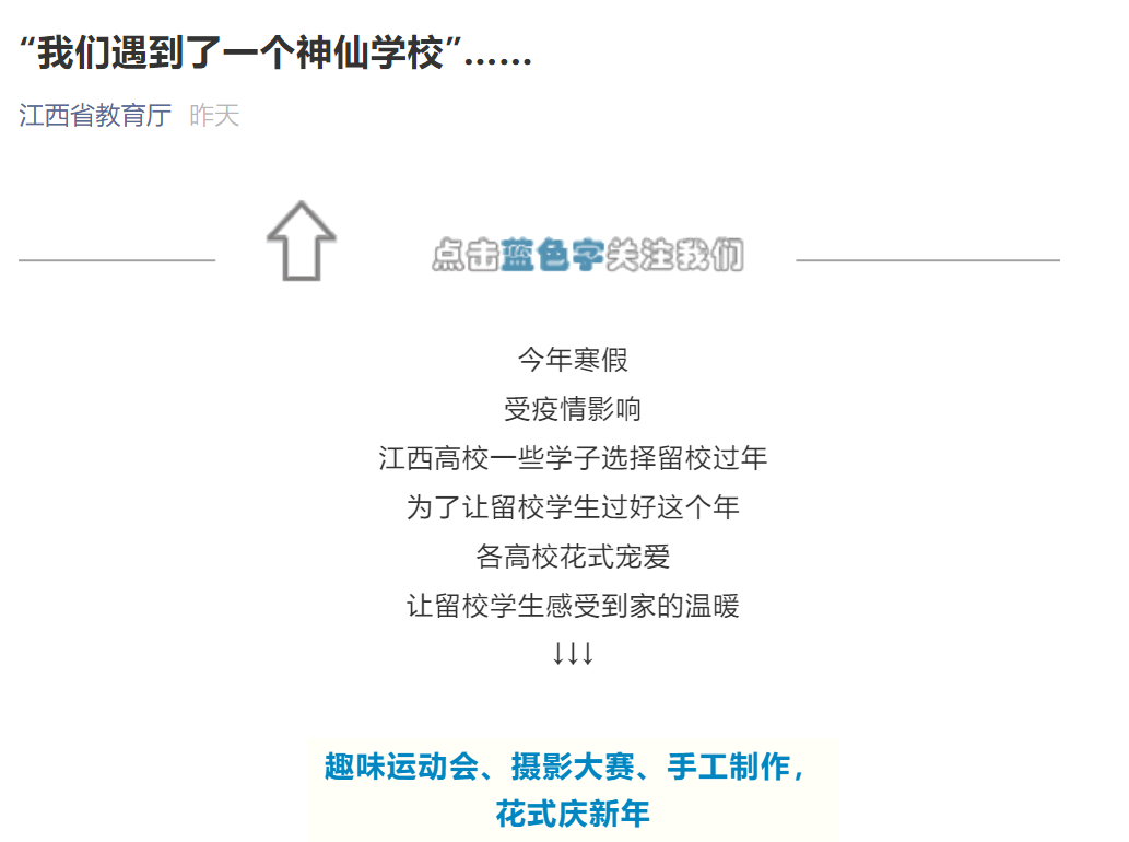 在江西理工大学,受疫情影响而选择留校过年的学生大约有80余人,为了缓解留校生的焦虑和孤独感,学校专门准备了“留家庄”,临时组建了留校宿舍。为了让留校生也能过个暖心年,学校开展了“五暖”活动:一是“暧心”,向留校过年学生发放爱心补助和春节生活礼包;二是“暖情”,开展共度一次年夜饭、看一场春晚、贴一副春联、包饺子等活动;三是“暖学”,开放学习场所、组织寒假读书活动;四是“暖行”,发放防疫大礼包;五是“暖身”,开放部分室内外体育锻炼场所,鼓励大家积极运动。