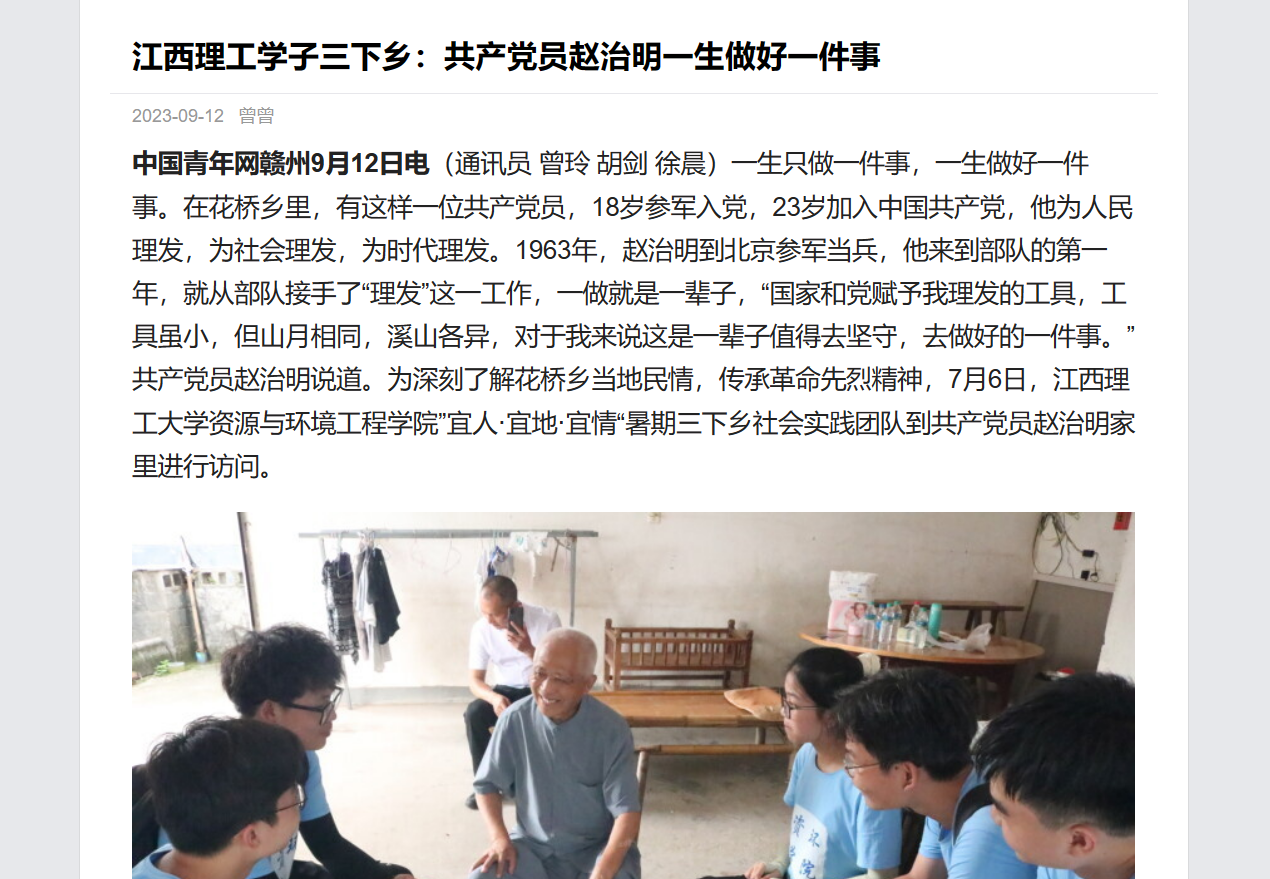 中国青年网赣州9月12日电(通讯员 曾玲 胡剑 徐晨)一生只做一件事,一生做好一件事。在花桥乡里,有这样一位共产党员,18岁参军入党,23岁加入中国共产党,他为人民理发,为社会理发,为时代理发。1963年,赵治明到北京参军当兵,他来到部队的第一年,就从部队接手了“理发”这一工作,一做就是一辈子,“党和国家赋予我理发的工具,工具虽小,但山月相同,溪山各异,对于我来说这是一辈子值得去坚守,去做好的一件事。”共产党员赵治明说道。为深刻了解花桥乡当地民情,传承革命先烈精神,7月6日,安博站官网登录入口,安博(中国)”宜人·宜地·宜情“暑期三下乡社会实践团队到共产党员赵治明家里进行访问。