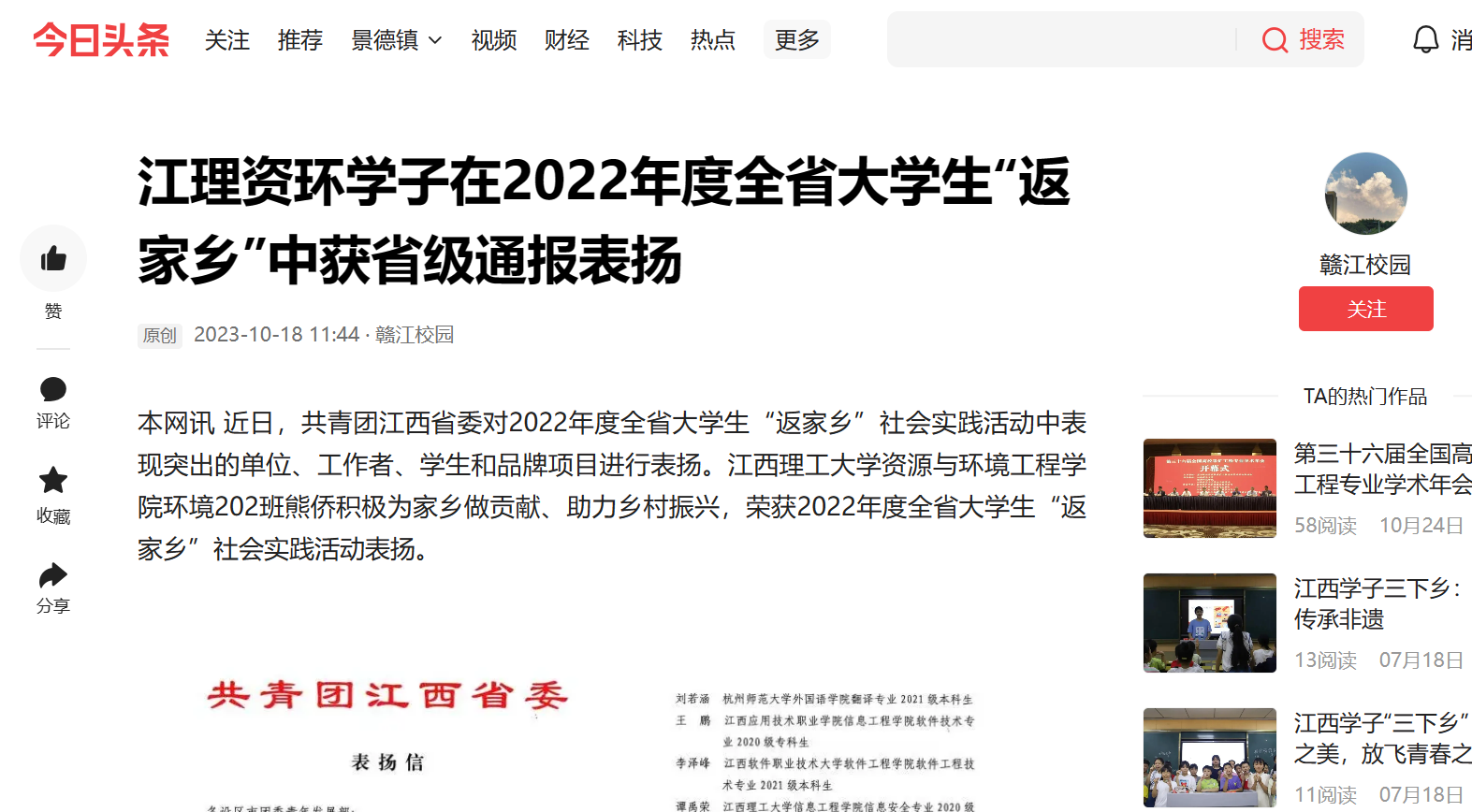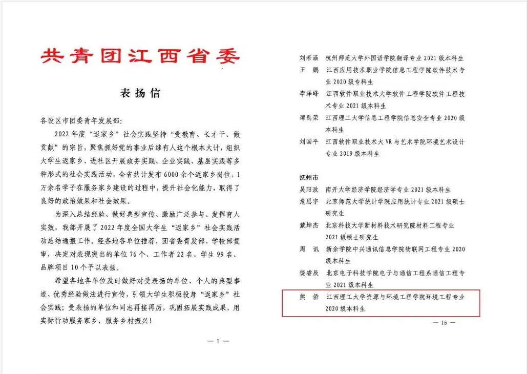 本网讯 近日,共青团江西省委对2022年度全省大学生“返家乡”社会实践活动中表现突出的单位、工作者、学生和品牌项目进行表扬。安博站官网登录入口,安博(中国)环境202班熊侨积极为家乡做贡献、助力乡村振兴,荣获2022年度全省大学生“返家乡”社会实践活动表扬。
