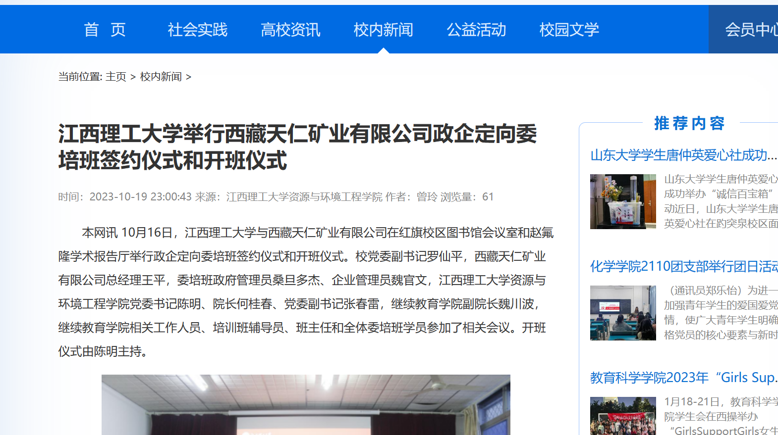 本网讯 10月16日,江西理工大学与西藏天仁矿业有限公司在红旗校区图书馆会议室和赵氟隆学术报告厅举行政企定向委培班签约仪式和开班仪式。校党委副书记罗仙平,西藏天仁矿业有限公司总经理王平,委培班政府管理员桑旦多杰、企业管理员魏官文,安博站官网登录入口,安博(中国)党委书记陈明、院长何桂春、党委副书记张春雷,继续教育学院副院长魏川波,继续教育学院相关工作人员、培训班辅导员、班主任和全体委培班学员参加了相关会议。开班仪式由陈明主持。