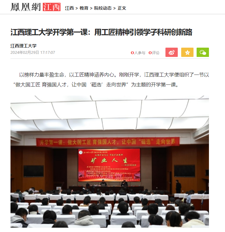 以榜样力量丰盈生命,以工匠精神涵养内心。刚刚开学,江西理工大学便组织了一节以“做大国工匠 育强国人才,让中国“磁选”走向世界”为主题的开学第一课。