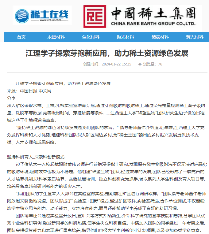 “坚持稀土资源的绿色可持续发展是我们团队的宗旨。” 指导老师董伟介绍道,近年来,江西理工大学充分发挥科研和人才优势,组建科研团队深入矿区周边乡村,为“稀土王国”赣州的乡村振兴发展提供技术支撑、人才支撑和成果供给。