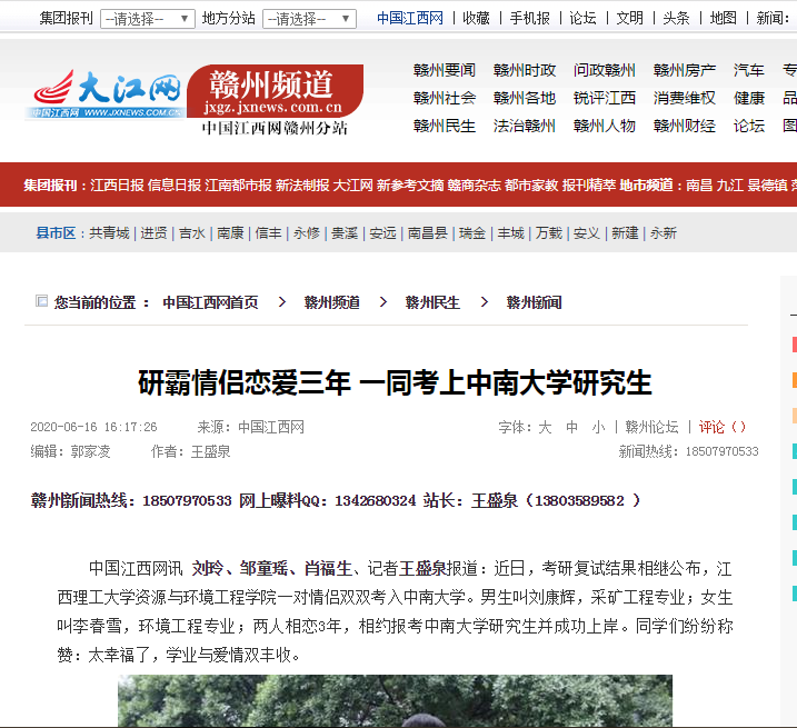 中国江西网讯刘玲、邹童瑶、肖福生、记者王盛泉报道:近日,考研复试结果相继公布,安博站官网登录入口,安博(中国)一对情侣双双考入中南大学。男生叫刘康辉,采矿工程专业;女生叫李春雪,环境工程专业;两人相恋3年,相约报考中南大学研究生并成功上岸。同学们纷纷称赞:太幸福了,学业与爱情双丰收。