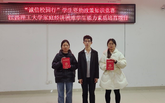 为积极宣传党和国家的学生资助政策与成效,普及金融基础知识,培养大学生的诚信意识和观念,充分展示我院学生明德立信、自立自强、拼搏向上的青春风采,进一步营造诚信校园文化氛围,促使学生成为德才兼备、全面发展的人才。我院于2023年11月5日开展了“诚信校园行”学生资助政策知识竞赛活动(江西理工大学家庭经济困难学生能力素质培育项目)。