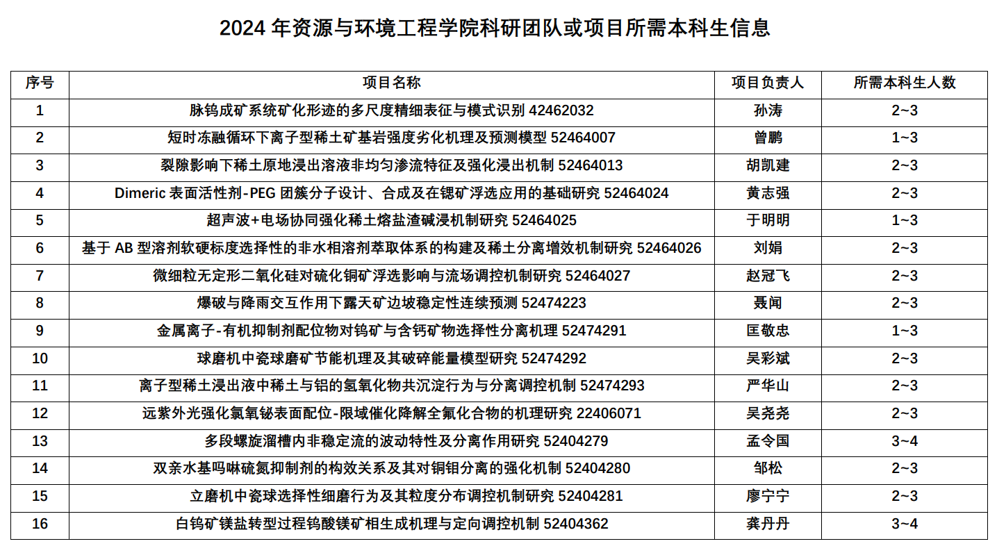 2024年资源与环境工程学院科研团队或项目所需本科生信息