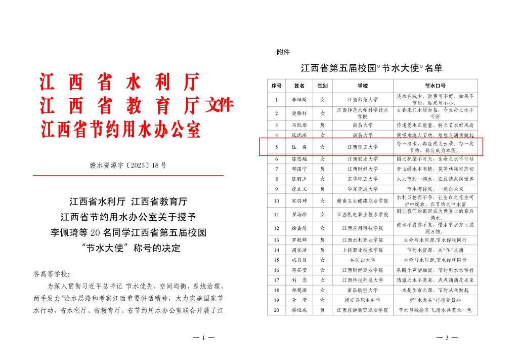 本网讯 近日,江西省水利厅江西省教育厅江西省节约用水办公室联合发布《关于授予李佩琦等20名同学江西省第五届校园“节水大使”称号的决定》(赣水资源字〔2023〕18 号),我院环境211班匡奕荣获了江西省第五届校园“节水大使”称号,是学校唯一获奖