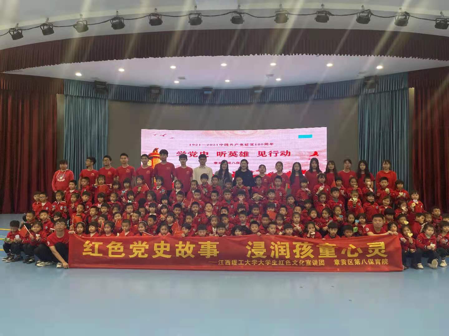 本网讯 4月19日,我院大学生红色文化宣讲团和章贡区第八保育院一同开展了题为“红色党史故事,浸润孩童心灵”的党史宣讲活动。章贡区第八保育院院长王一红,我院党建组织员赖华、大学生红色文化宣讲团指导老师张小普以及大学生红色文化宣讲团19名宣讲员一同进入章贡区第八保育院给小朋友们讲红色党史故事,传扬红色革命精神。